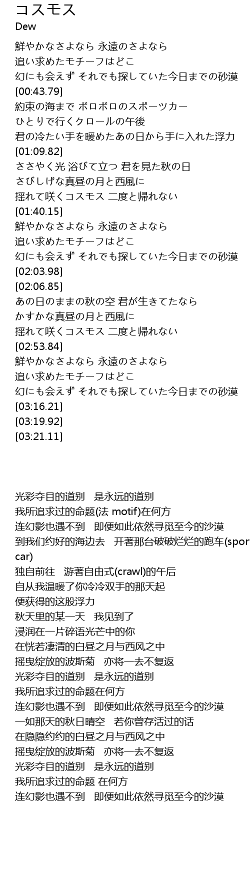 | [02:42.71] | 摇曳绽放的波斯菊 亦将一去不复返 |