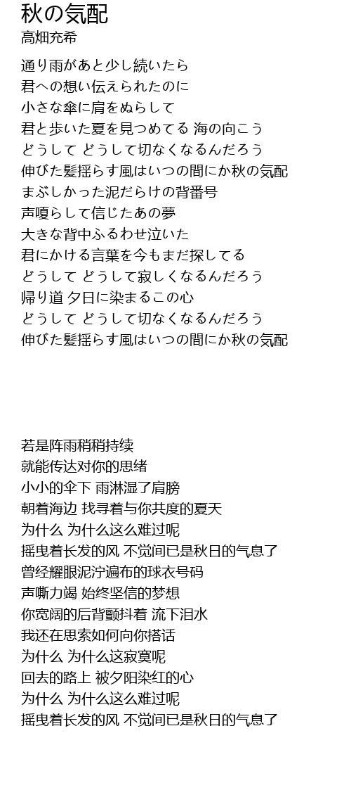 | [01:40.00] | 摇曳着长发的风 不觉间已是秋日的气息了 |