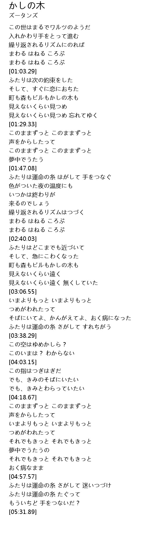 | [03:24.38] | ふたりは運命の糸 さがして すれちがう |