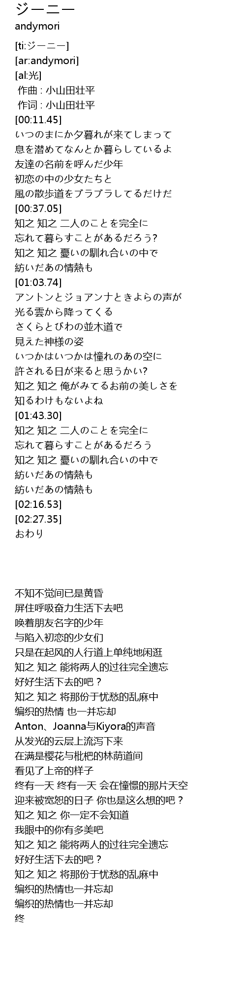 | [00:01.00] | 作词 : 小山田壮平 |
