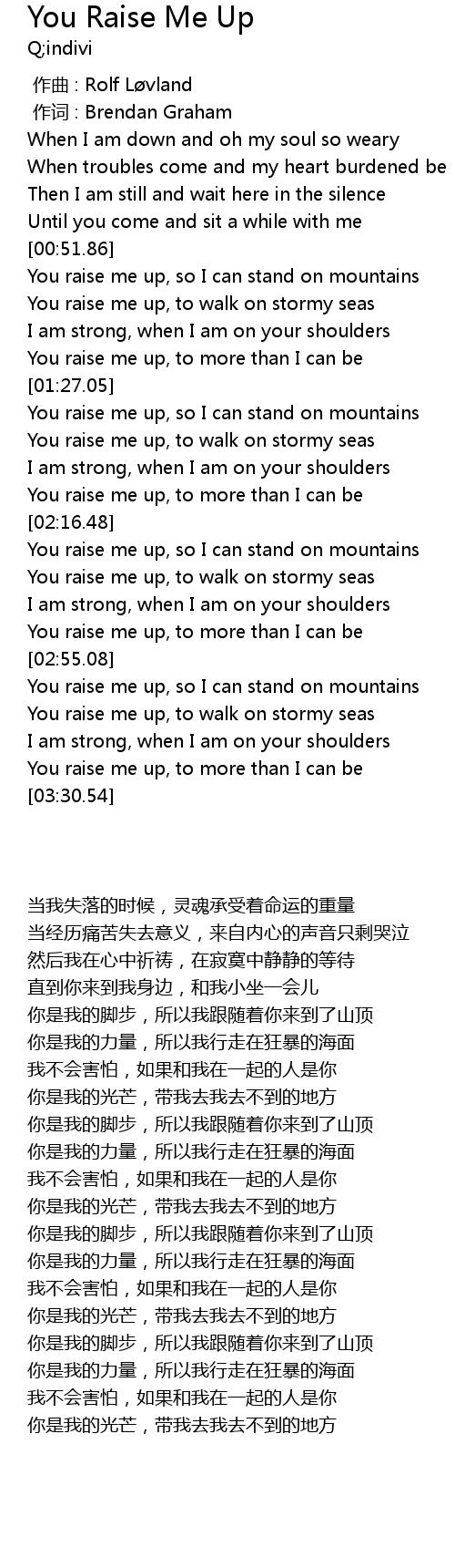 | [02:08.94] | You raise me up, to more than I can be |