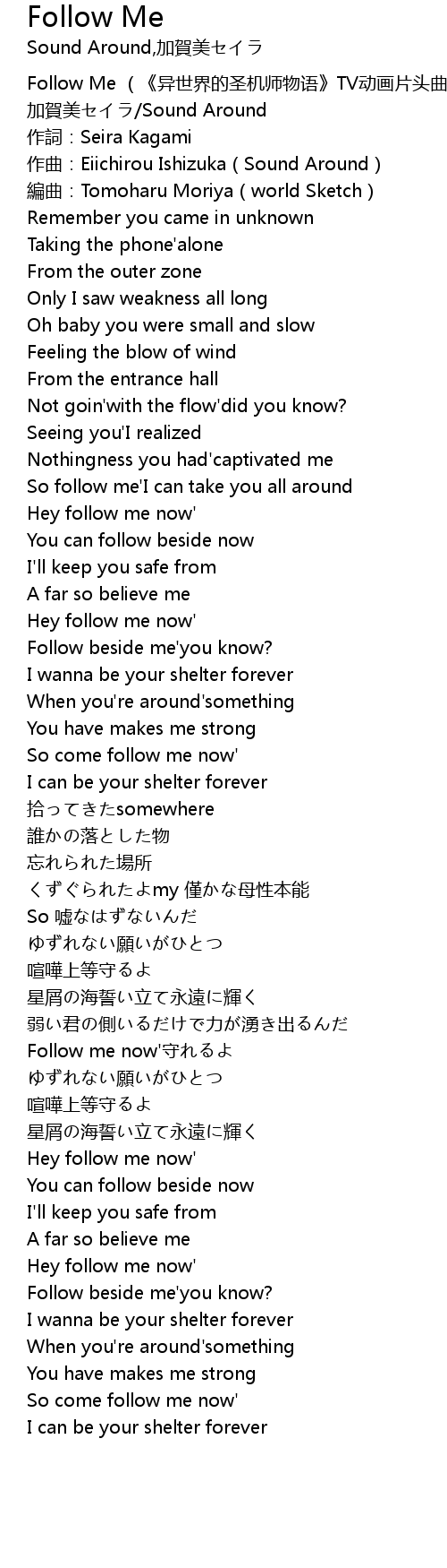 | [00:00.851] | Follow Me (《异世界的圣机师物语》TV动画片头曲) - 加賀美セイラ/Sound Around |