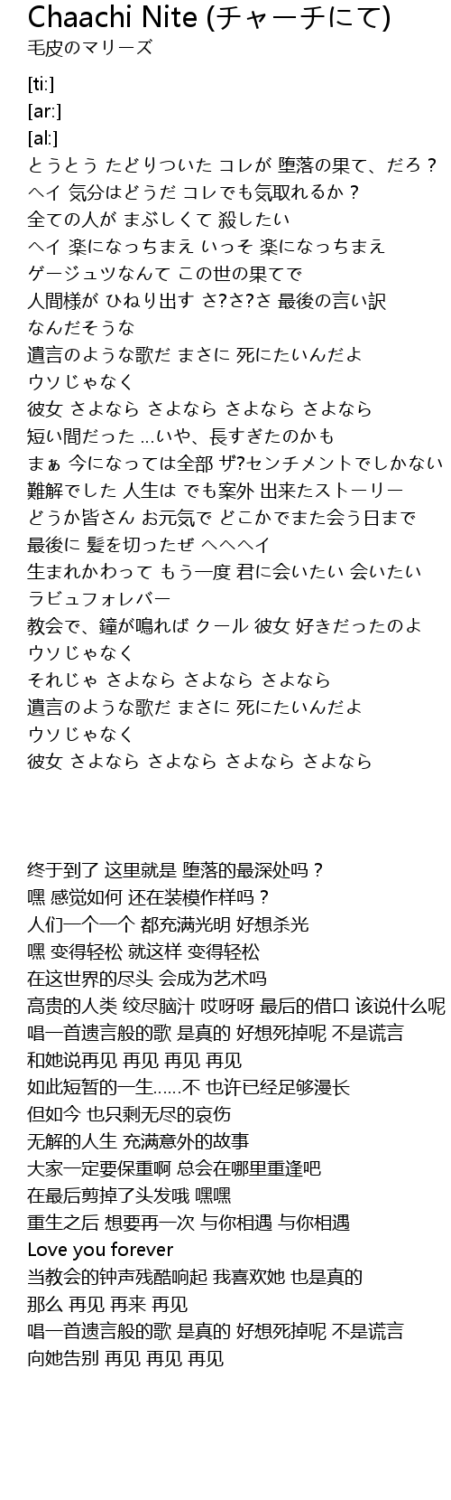 | [03:44.30] | 唱一首遗言般的歌 是真的 好想死掉呢 不是谎言 |