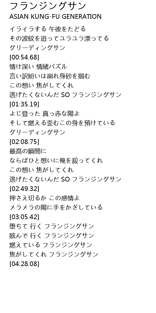 | [04:21.82] | 焦がしてくれ フランジングサン |