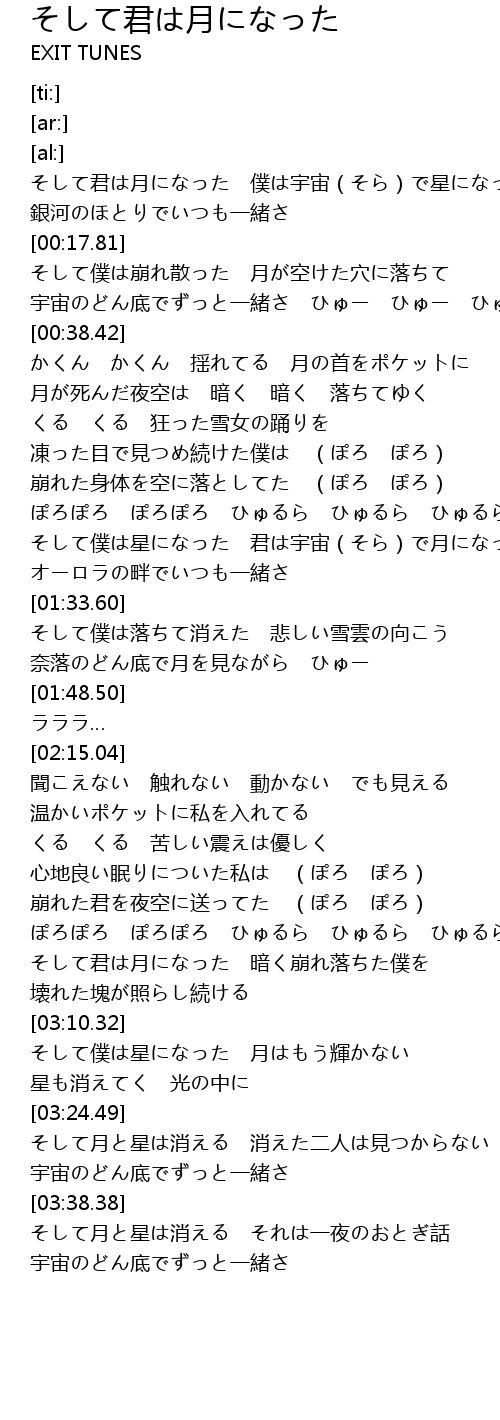 | [00:04.57] | そして君は月になった 僕は宇宙(そら)で星になった |