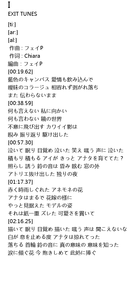 | [02:21.76] | 白が 息を止める度 アナタは掠れてった |