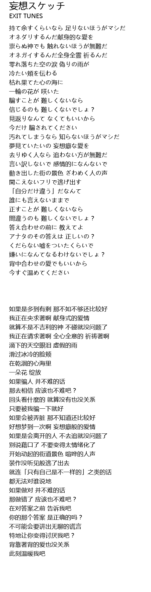 | [01:32.72] | 好想梦到一次啊 妄想癖般的爱情 |