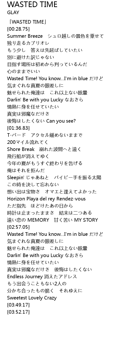 | [03:09.53] | Wasted Time! You know…I'm in blue だけど |