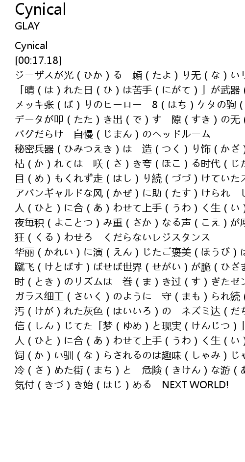 | [01:08.57] | 人(ひと)に合(あ)わせて上手(うわ)く生(い)きる シニカルな舞台(ぷてい)で |