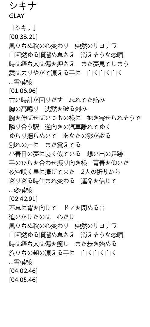 | [00:42.19] | 山河燃ゆる頃溜め息さえ 消えそうな恋唄 |