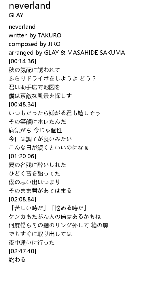 | [00:12.32] | arranged by GLAY & MASAHIDE SAKUMA |