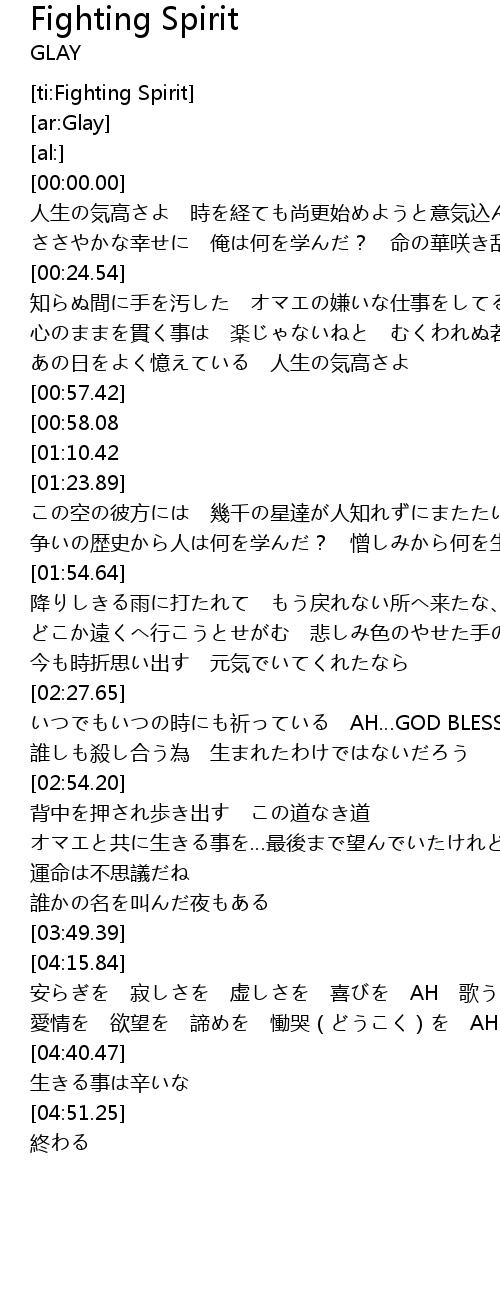 | [04:02.64][01:10.42] | 孤独が戦う日々が終わるまでは AH 歌うよ |