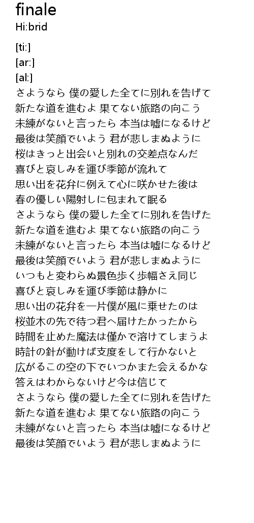 | [01:39.71] | さようなら 僕の愛した全てに別れを告げた |