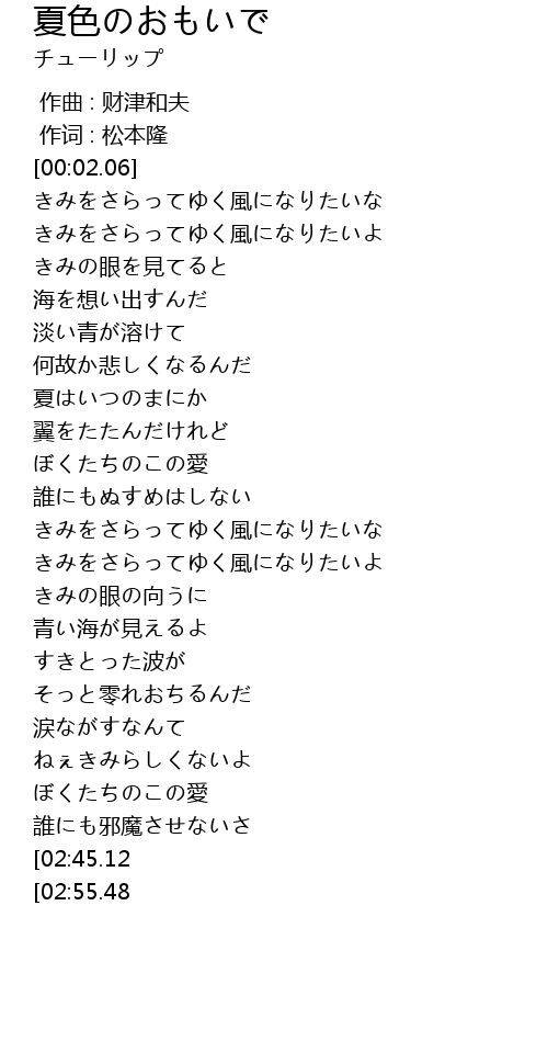 | [03:06.28][02:45.12][02:25.69] | きみをさらってゆく風になりたいな |