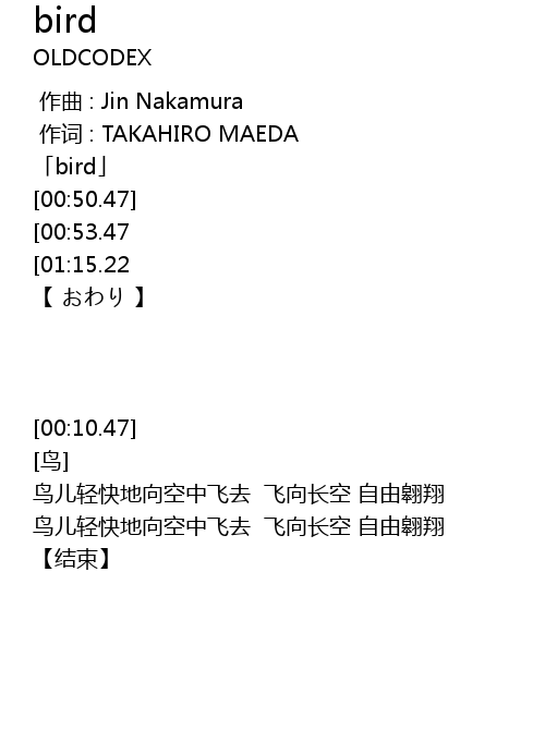 | [01:57.08][00:53.47] | dà kōng wǔ niǎo zhì yǔ guǎng xíng |