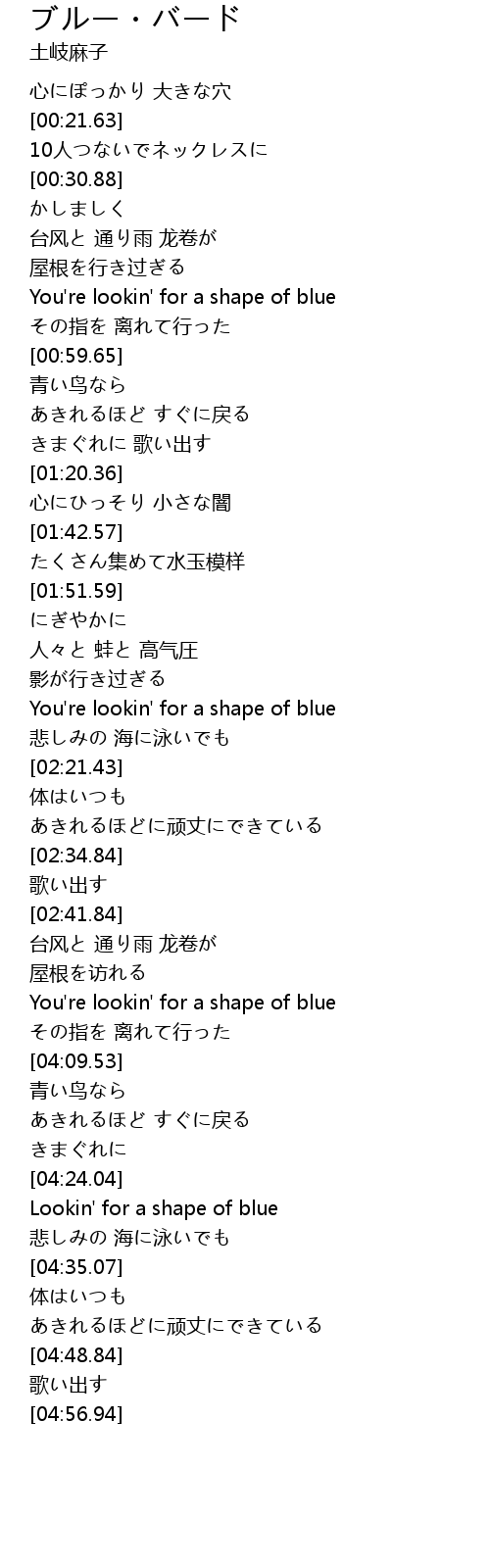 | [03:58.64] | You're lookin' for a shape of blue |