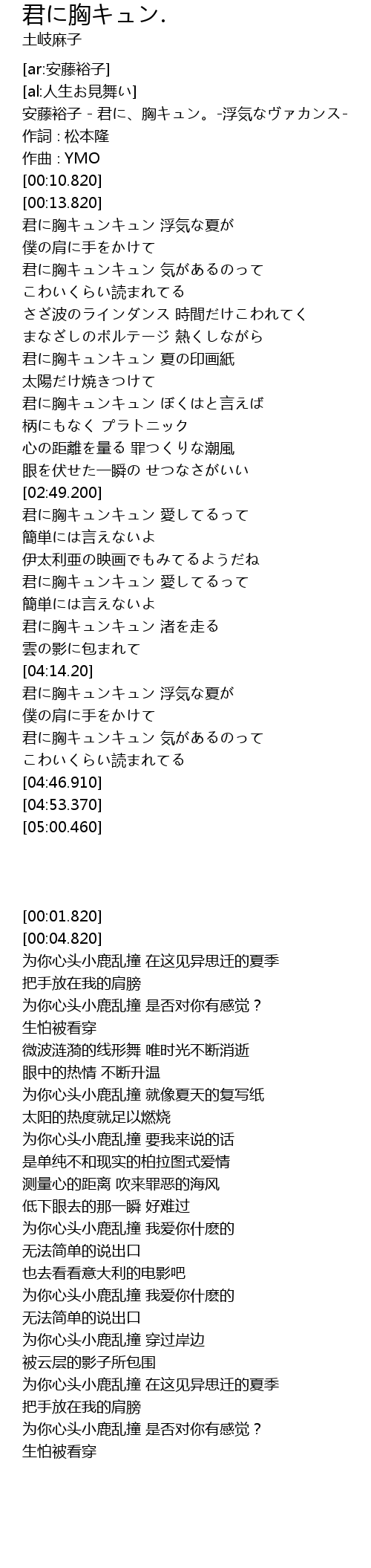 | [00:01.820] | 安藤裕子 - 君に、胸キュン。-浮気なヴァカンス- |