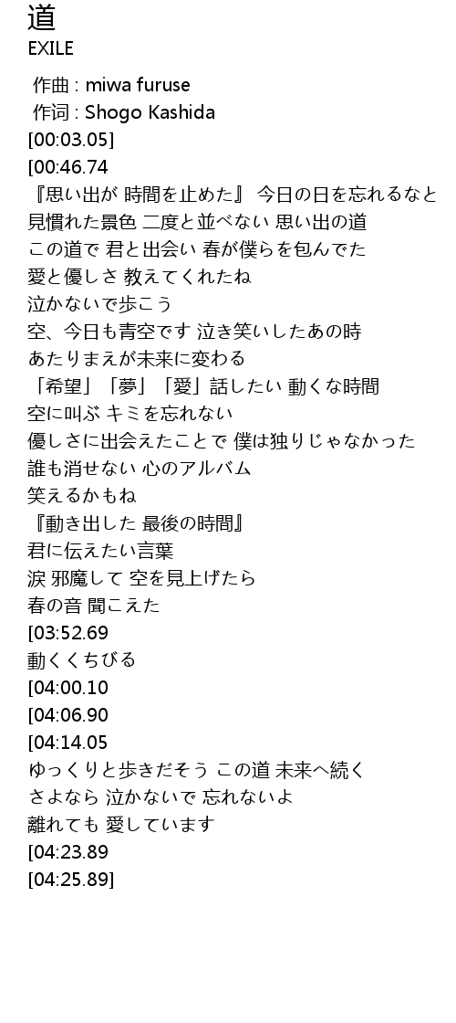 | [02:54.36][03:52.69] | 道、君と歩いた今日まで かすかに 動くくちびる |