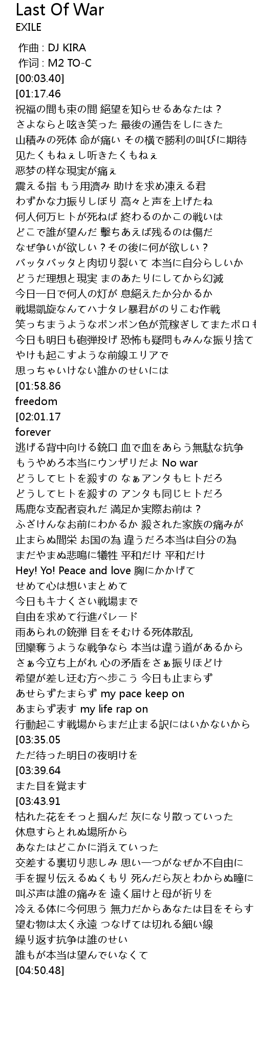 | [01:56.63][02:01.17][03:32.53][03:27.99][03:23.34][03:18.83] | No war Keep it forever |
