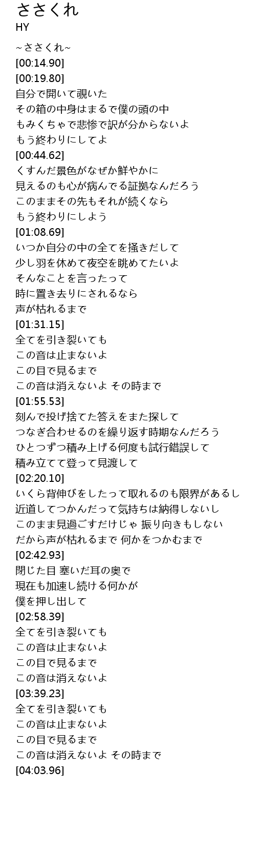 | [03:55.43] | この音は消えないよ その時まで |