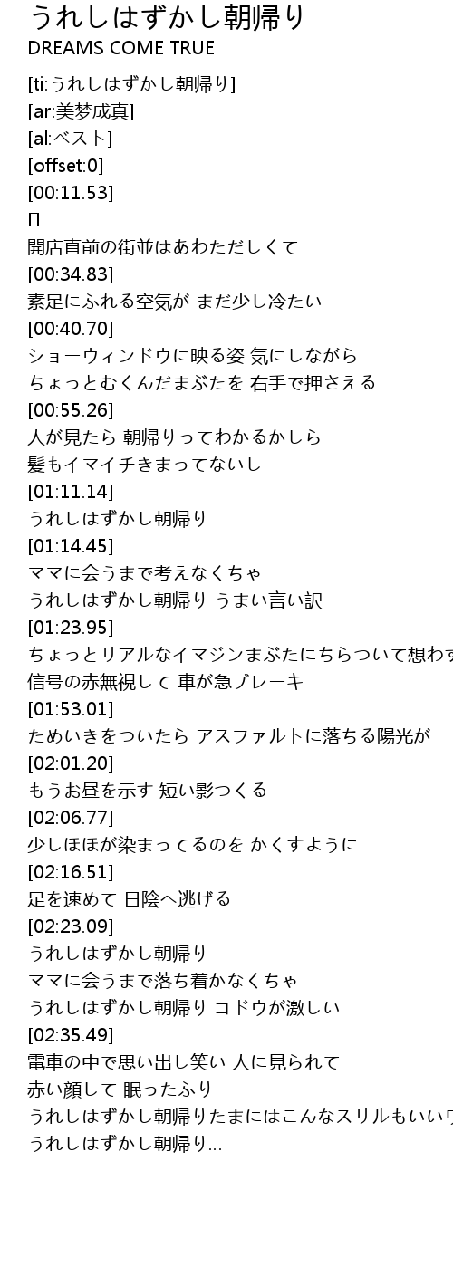 | [02:23.89] | うれしはずかし朝帰り ママに会うまで落ち着かなくちゃ |