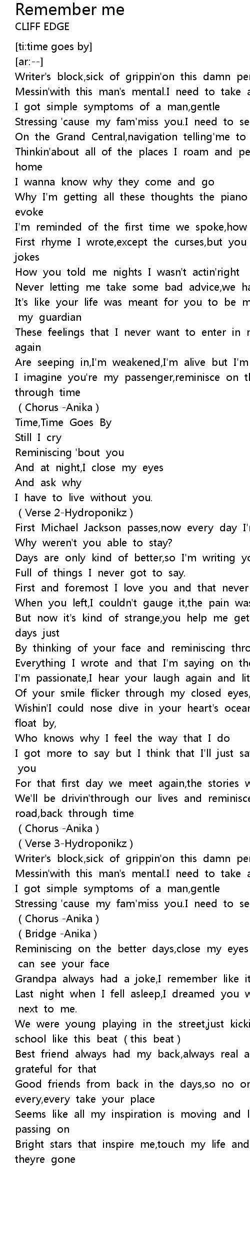 | [03:30.456] | Reminiscing on the better days, close my eyes and its like I can see your face |