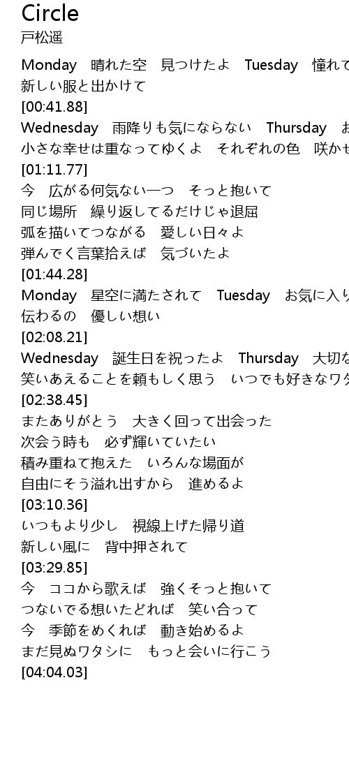 | [01:49.05] | Monday 星空に満たされて Tuesday お気に入りの指先へ |