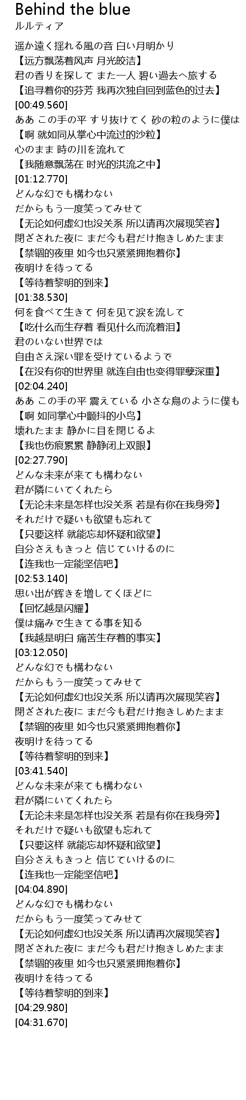 | [01:26.370] | 閉ざされた夜に まだ今も君だけ抱きしめたまま |