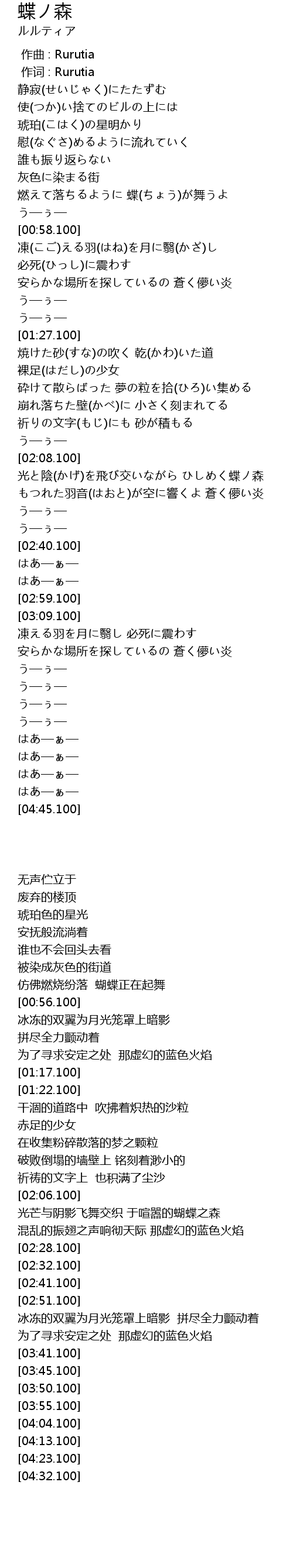 | [02:09.100] | 光芒与阴影飞舞交织 于喧嚣的蝴蝶之森 |