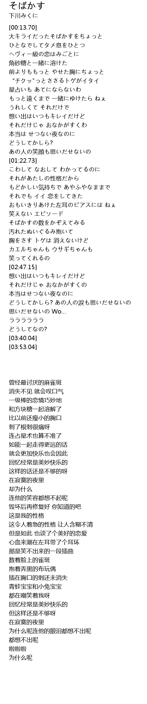 | [00:15.70] | 大キライだったそばかすをちょっと |
