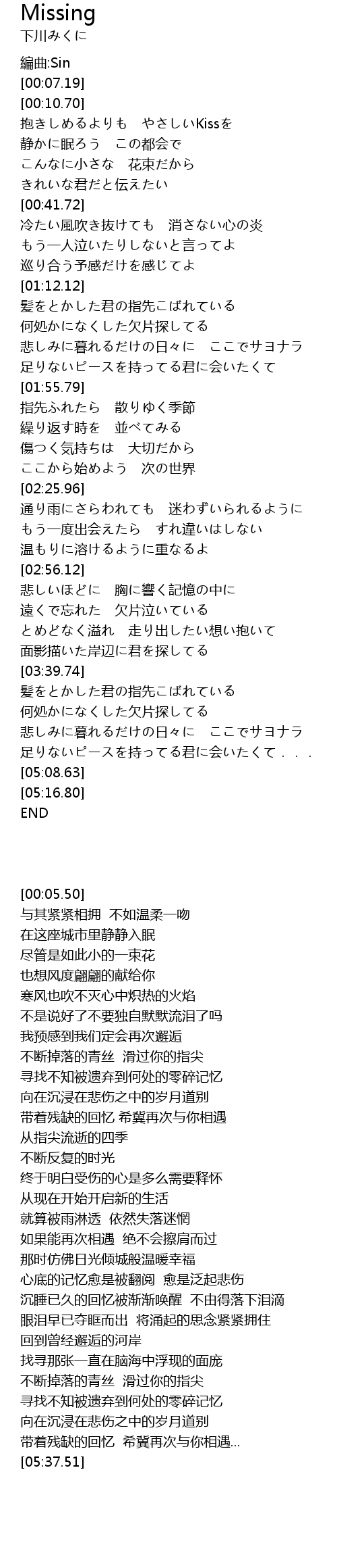 | [04:56.94] | 足りないピースを持ってる君に会いたくて... |