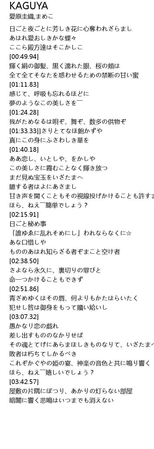 | [03:27.75] | これぞかぐやの姫の宴、神楽の音色と共に鳴り響く |