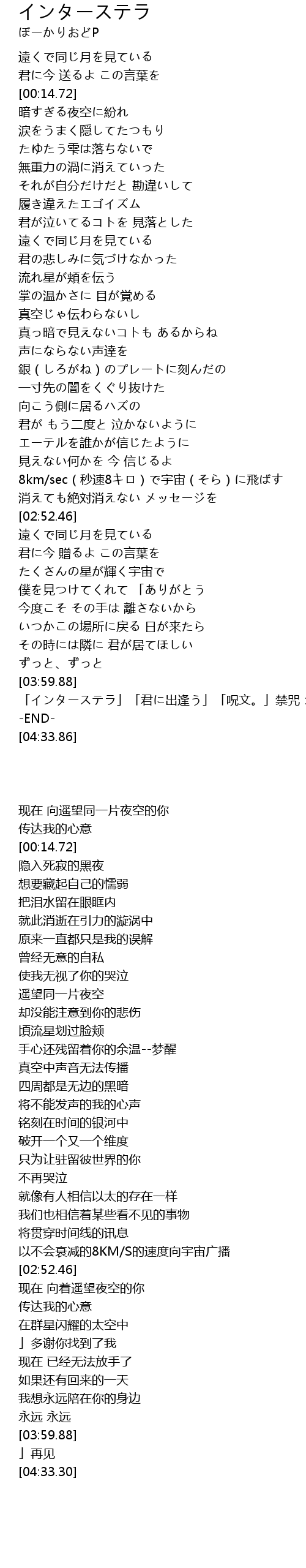 | [04:06.96] | 「インターステラ」「君に出逢う」「呪文。」禁咒:「インターステラ |