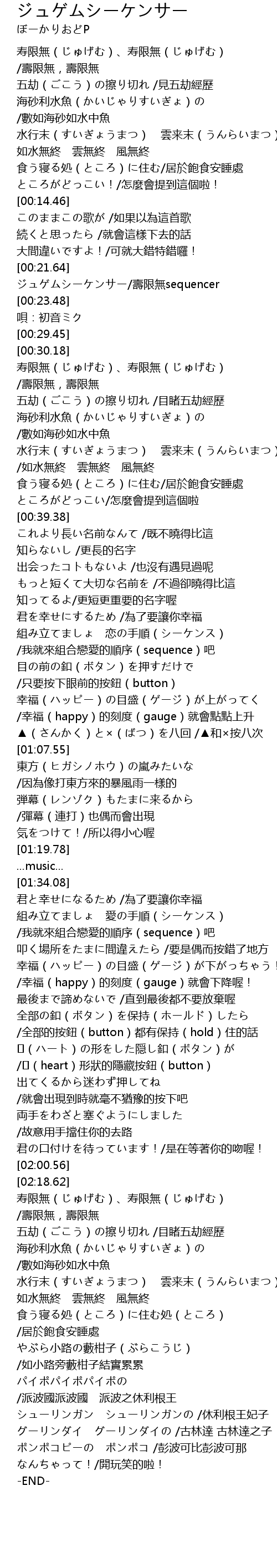 | [02:19.95] | 寿限無(じゅげむ)、寿限無(じゅげむ) /壽限無,壽限無 |