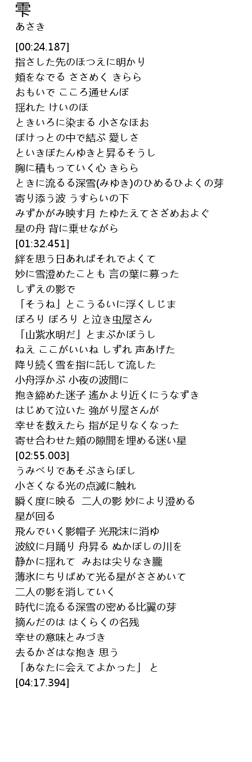 | [03:44.875] | 薄氷にちりばめて光る星がささめいて |