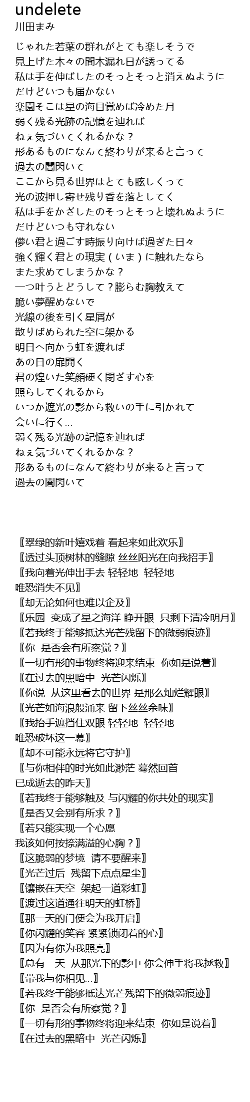 | [03:08.216] | 〖若只能实现一个心愿 我该如何按捺满溢的心胸?〗 |