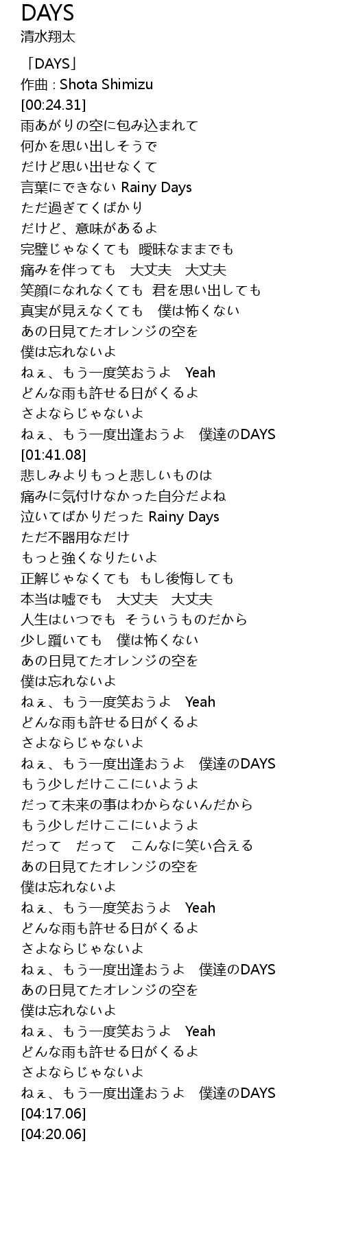 | [03:45.63] | ねぇ、もう一度出逢おうよ 僕達のDAYS |