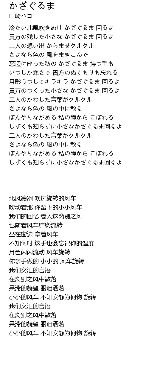 | [00:15.41] | 冷たい北風吹きぬけ かざぐるま 回るよ |