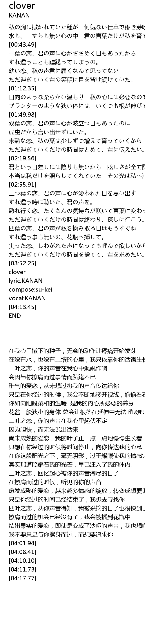 | [03:22.63] | 四叶之恋,从你声音得知,我被采摘的日子也很快到了 |