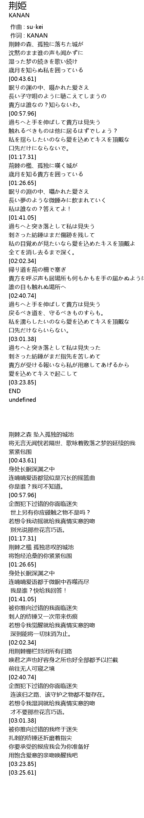 | [03:06.45] | 刺さった紡錘がまだ指先を苦しめて |
