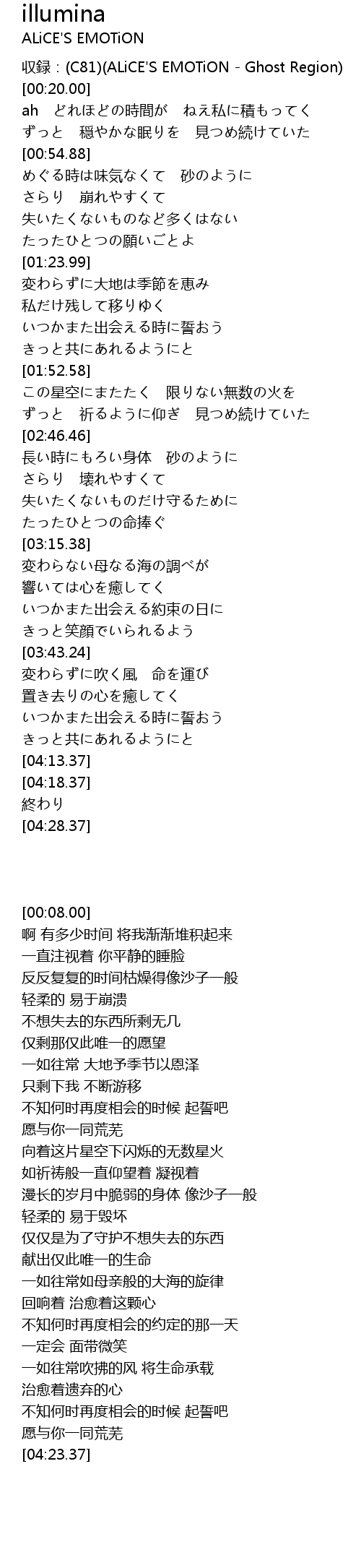 | [00:08.00] | shou lu: C81 ALiCE' S EMOTiON Ghost Region |