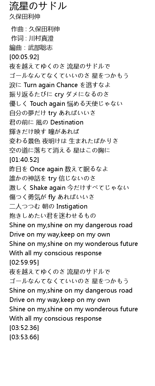 | [03:17.68] | 夜を越えてゆくのさ 流星のサドルで |