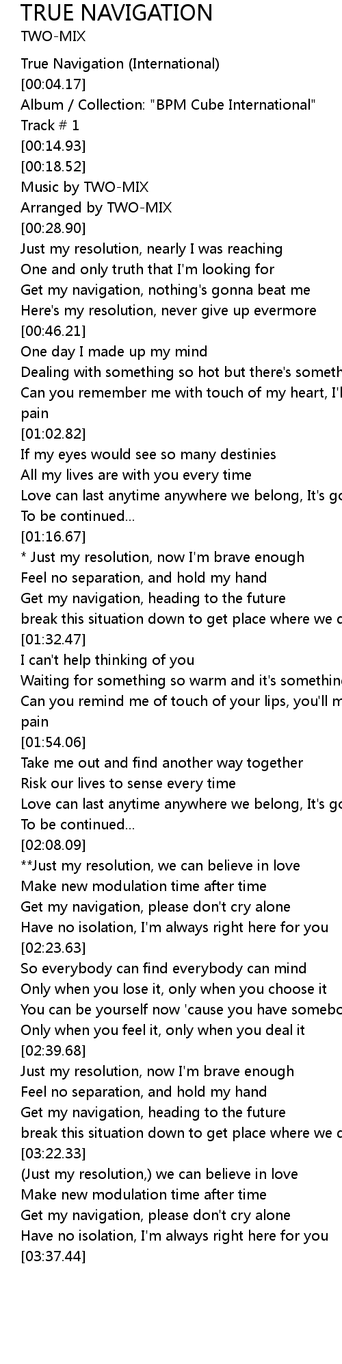 | [00:37.47] | Get my navigation, nothing's gonna beat me |