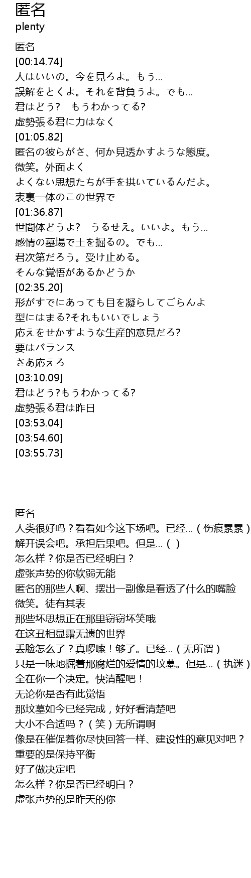 | [01:05.88] | 匿名の彼らがさ、何か見透かすような態度。 |