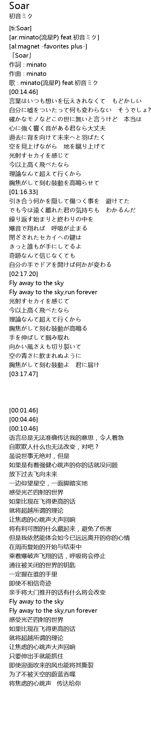 | [00:10.46] | 歌∶minato(流星P) feat.初音ミク |
