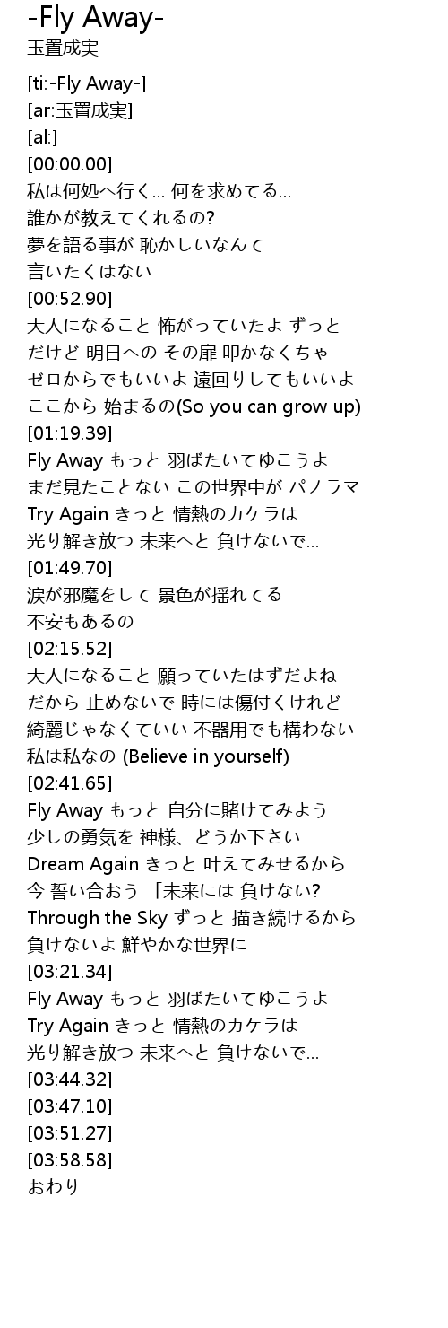 | [03:21.74] | Fly Away もっと 羽ばたいてゆこうよ |