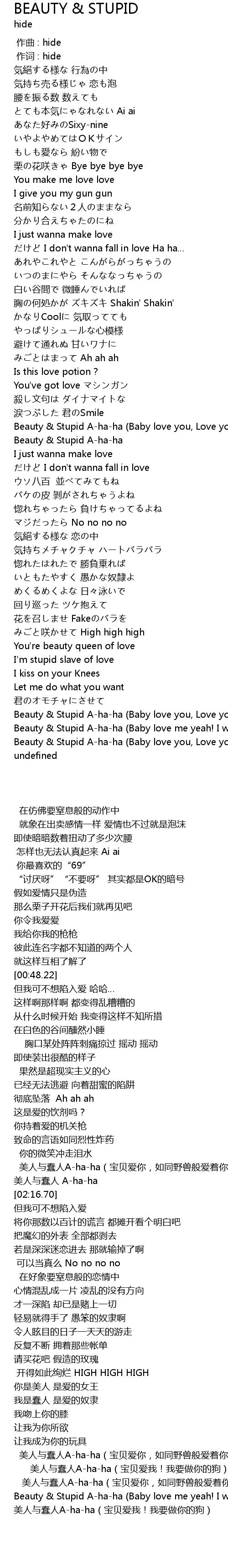 | [01:32.03] | Beauty & Stupid A-ha-ha (Baby love you, Love you like an animal) |