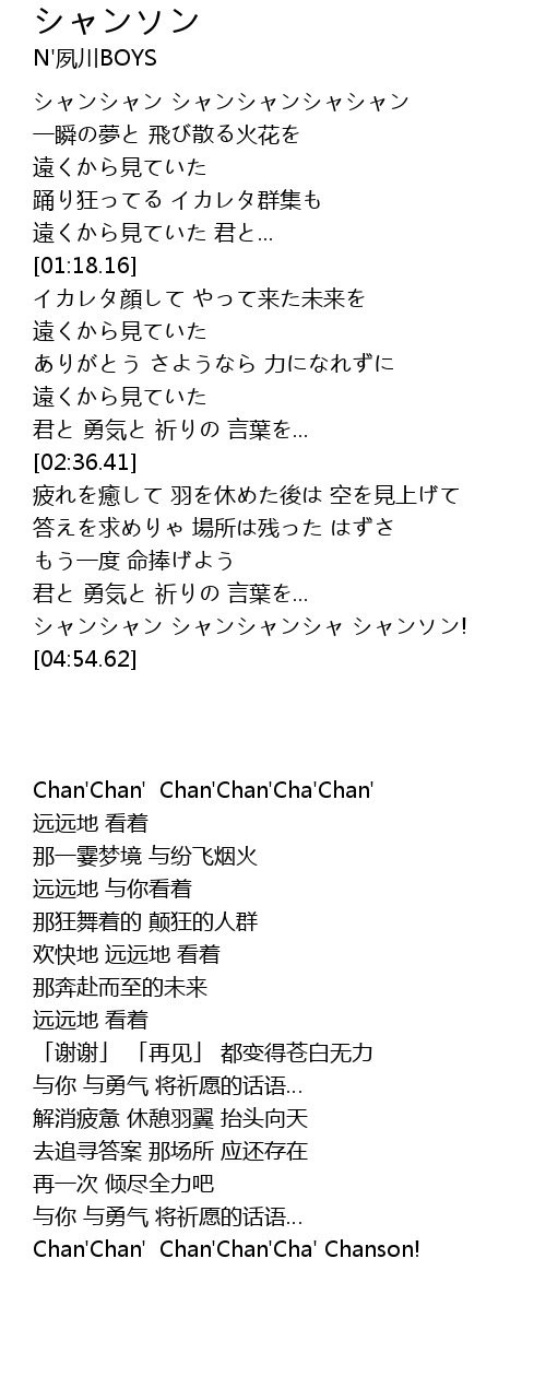 | [04:19.28] | Chan'Chan' Chan'Chan'Cha' Chanson! |