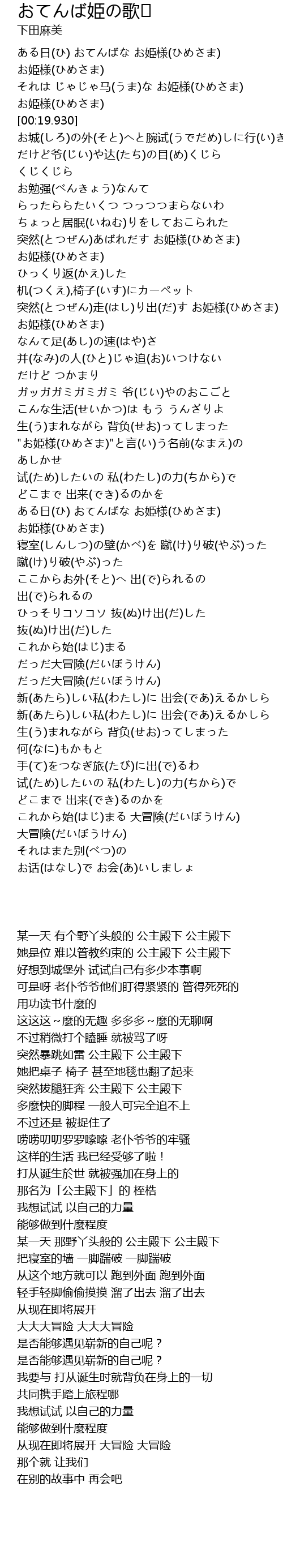 | [00:10.300] | ある日(ひ) おてんばな お姫様(ひめさま) お姫様(ひめさま) |