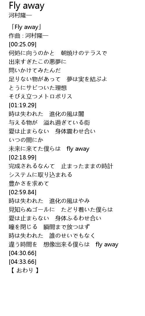 | [00:01.09] | 「Fly away」 |